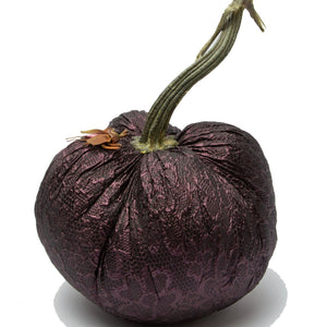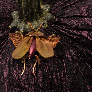 This One of a Kind is a plumb color python embossed fabric with a fantasic Sarah Cavender beatle. Perfect pairing. Each piece is hand cut and sewn to order and finished with a natural stem.  Our stems are specially curated varieties to ensure beautiful shapes and quality.  They are all signed in gold with Daria's signature giving it our authentic Hot Skwash touch.