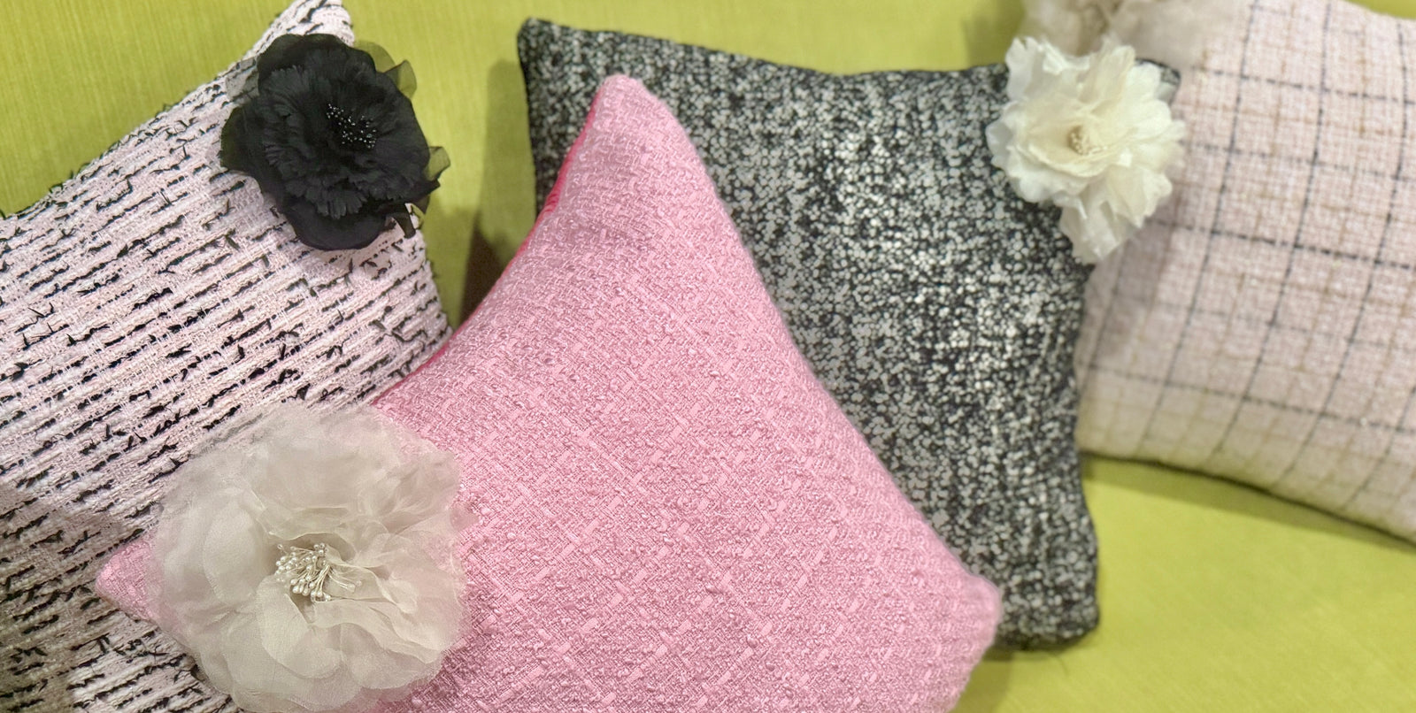 Silk velvet accent pillows adorned with couture silk flowers and layered with fine woven bouclé fabrics for rich texture and sculptural dimension. Each pillow is thoughtfully crafted from curated materials, bringing softness, artistry, and individuality to every piece. No two are alike.